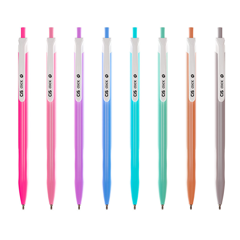 Caneta esferográfica retrátil com 8 cores diferentes. Corpo da cor da tinta, com clip branco e formato anatômico para encaixe na mão