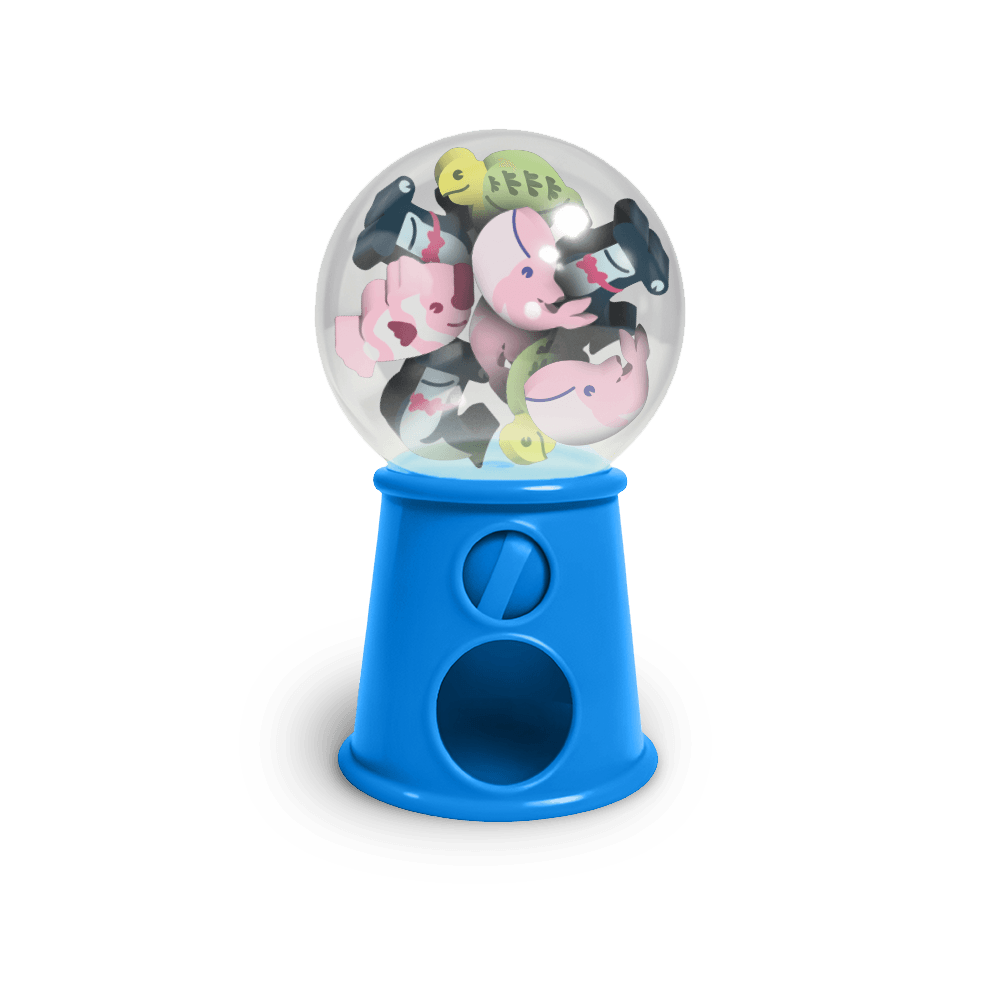 - Display Com 12 Potes Leo&Leo. Além de muito fofo, o baleiro vem com 12 mini borrachas em 4 estampas colecionáveis de animais marinhos (tartaruga, peixe, tubarão e baleia).